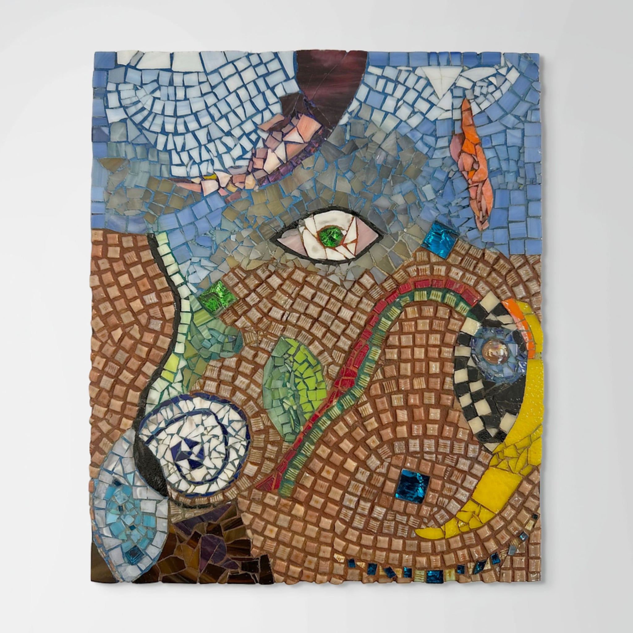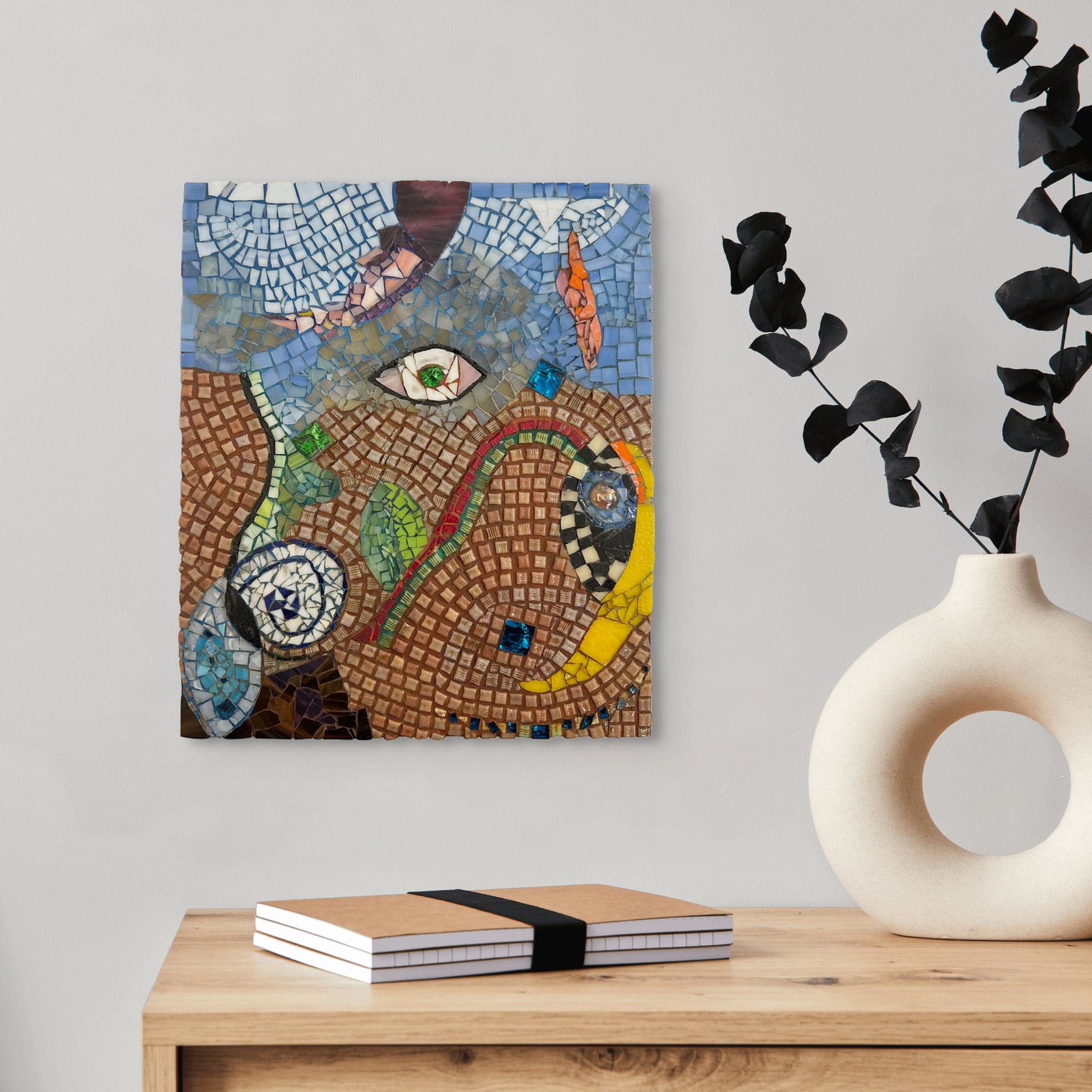A striking example of abstract expressionism, this 12" x 14" mosaic imagines the spirit of the forest as a vibrant, fragmented portrait. A single, realistic green eye peers out from the assemblage of earth tones and textures, grounding the piece with a sense of awareness and life, while the background of fragmented blue tiles evokes a clear sky peeking through a canopy.