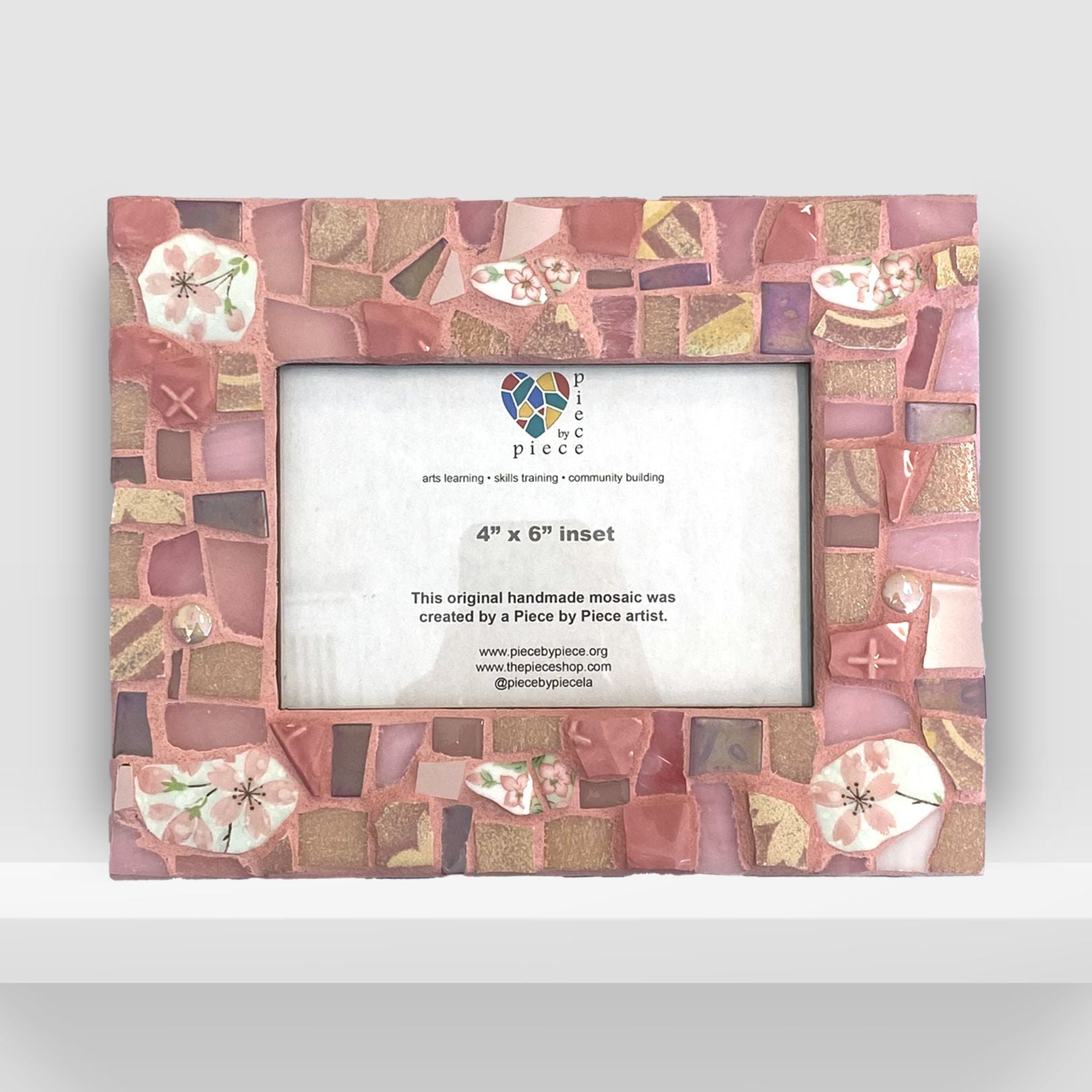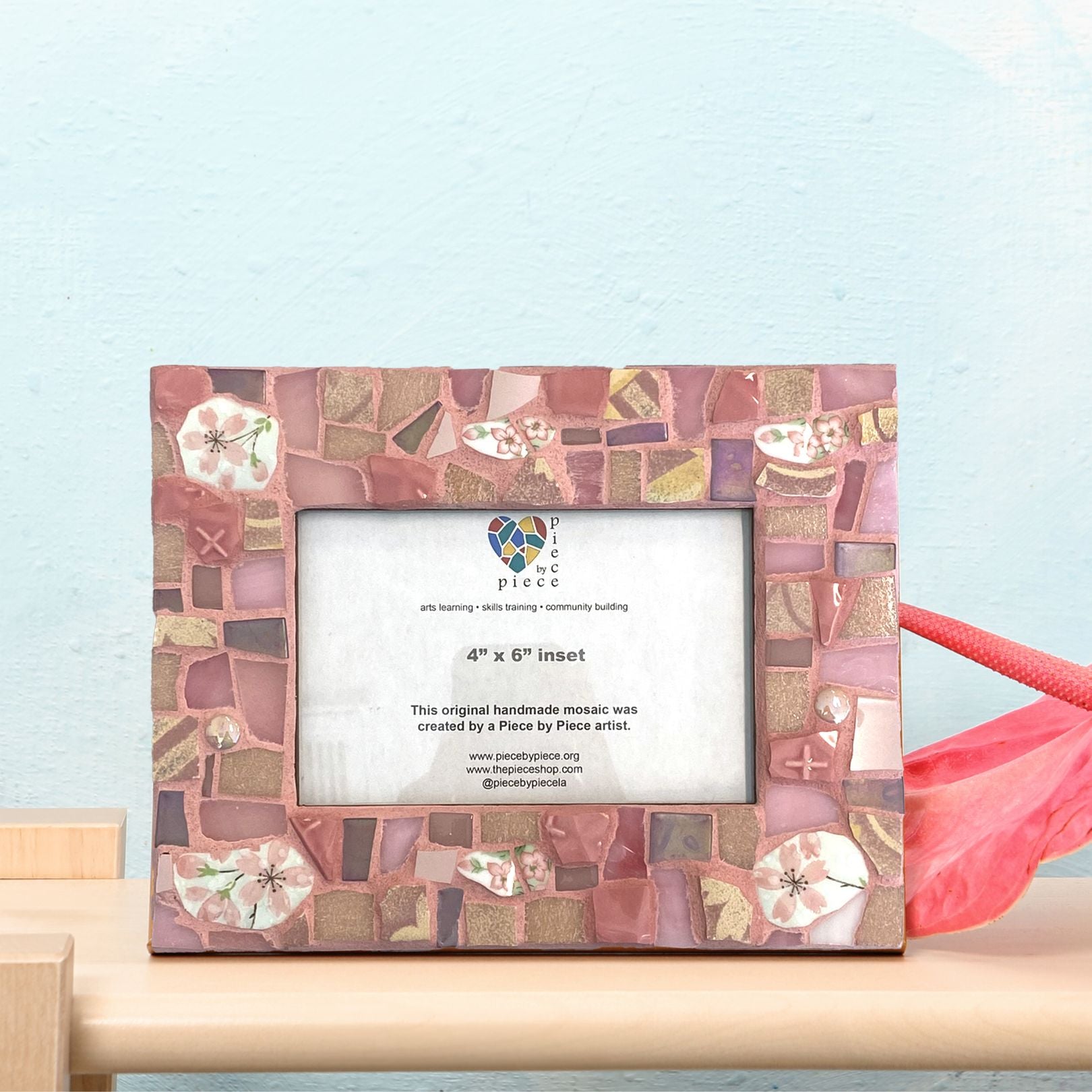 Perfect for the fan of all things girly, this 9.3" x 7.3" mosaic frame is made up of pink and purple pieces, accented with the cut outs of dainty pink flowers. This frame was created as a collaborative process in the Piece by Piece social enterprise. One artist created the design, others painted and prepped, and another grouted.