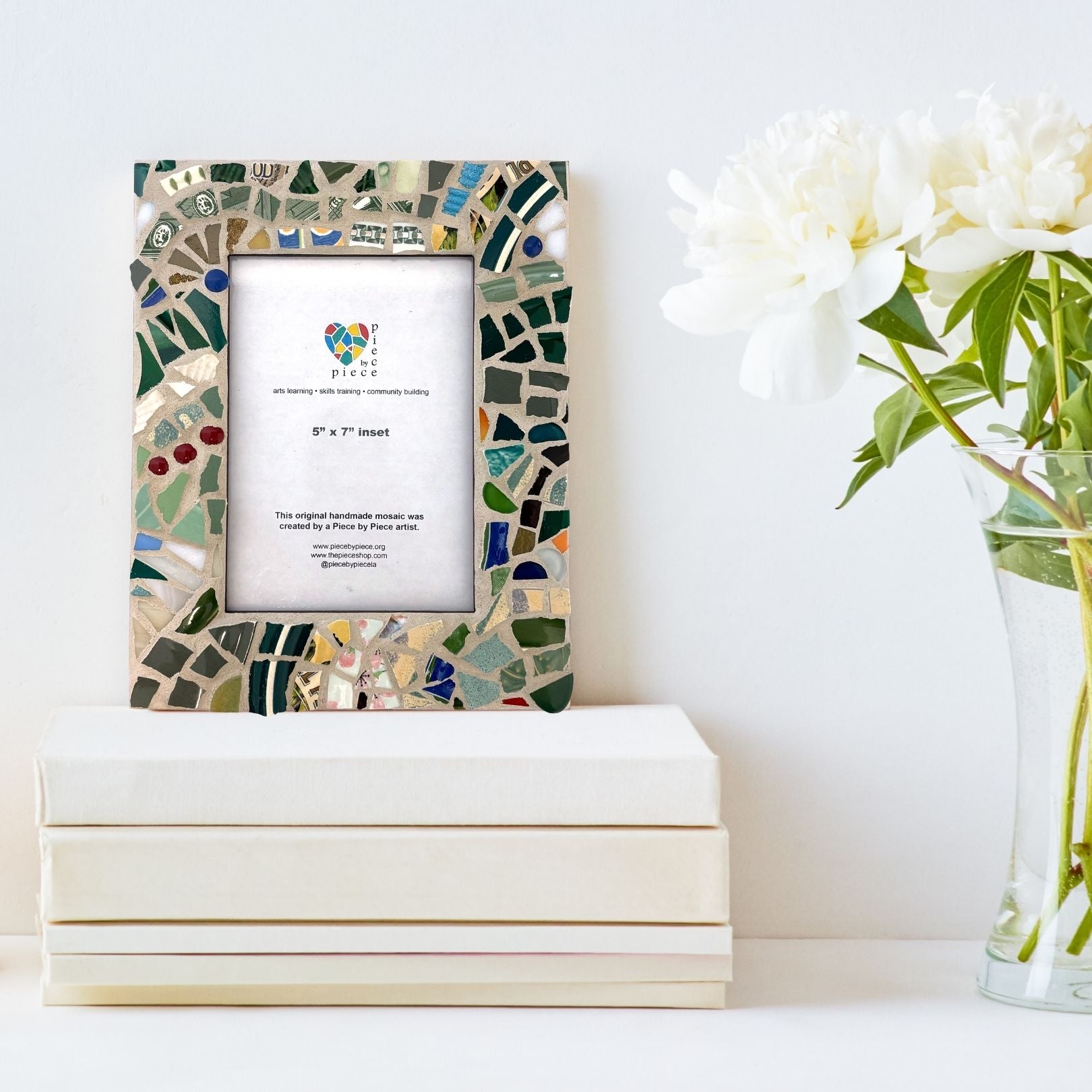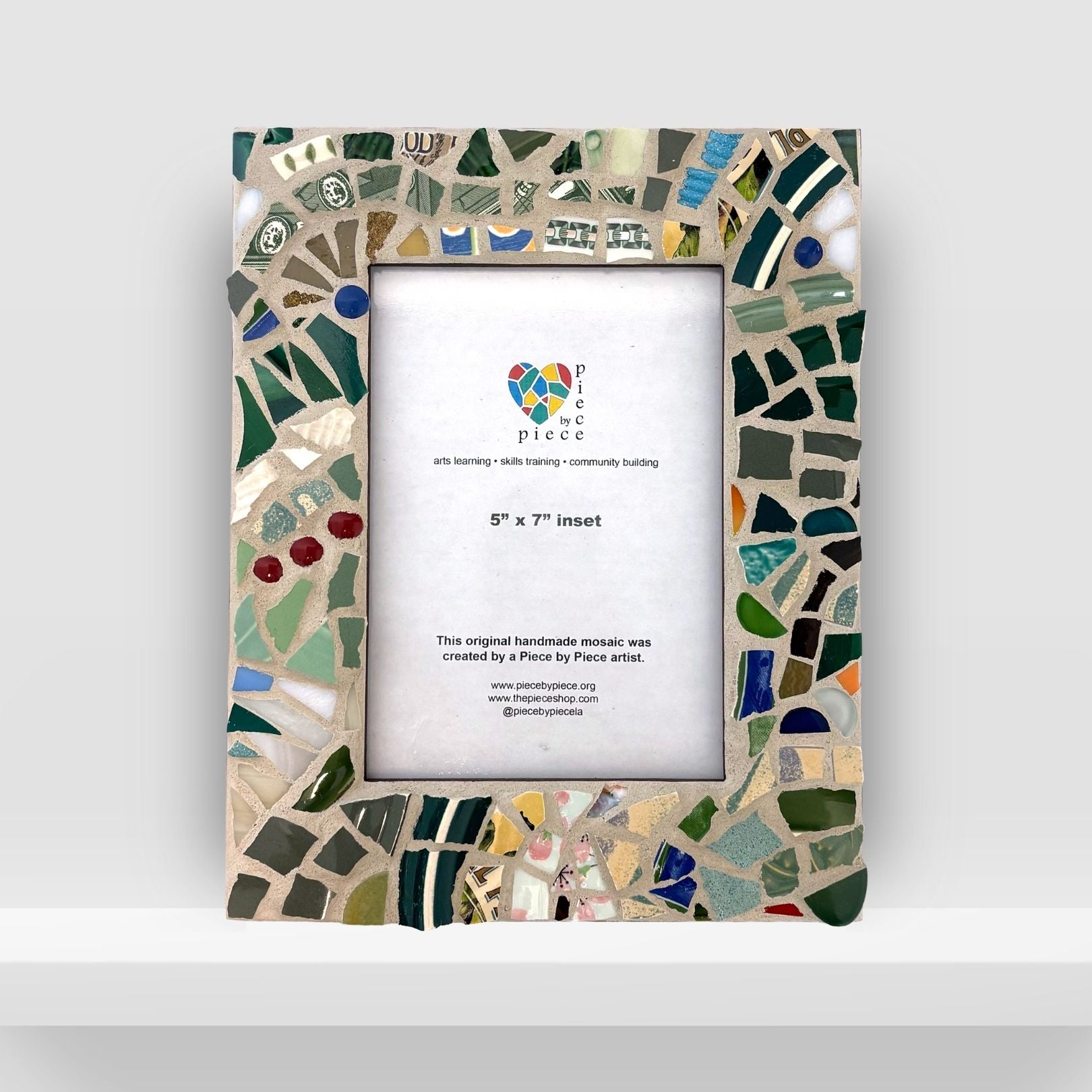 This frame was created as a collaborative process in the Piece by Piece social enterprise. One artist created the design, others painted and prepped, and another grouted.