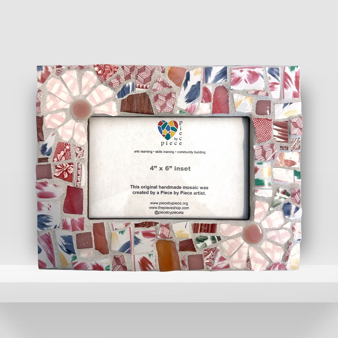 Capturing the charm of a cottage garden, this frame features two large, whimsical blooms that anchor the opposite corners of the photo window. The flowers are crafted from shards of pink and white patterned ceramic—featuring delicate plaids and checks—centered with smooth, rose-colored accents. Surrounding the floral design is an eclectic, patchwork background of red, blue, and patterned porcelain fragments that evoke the cozy feeling of a vintage quilt.