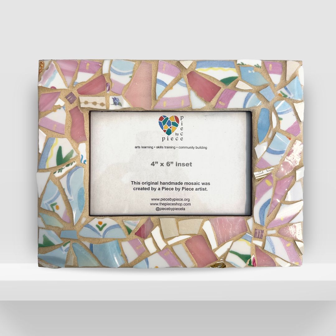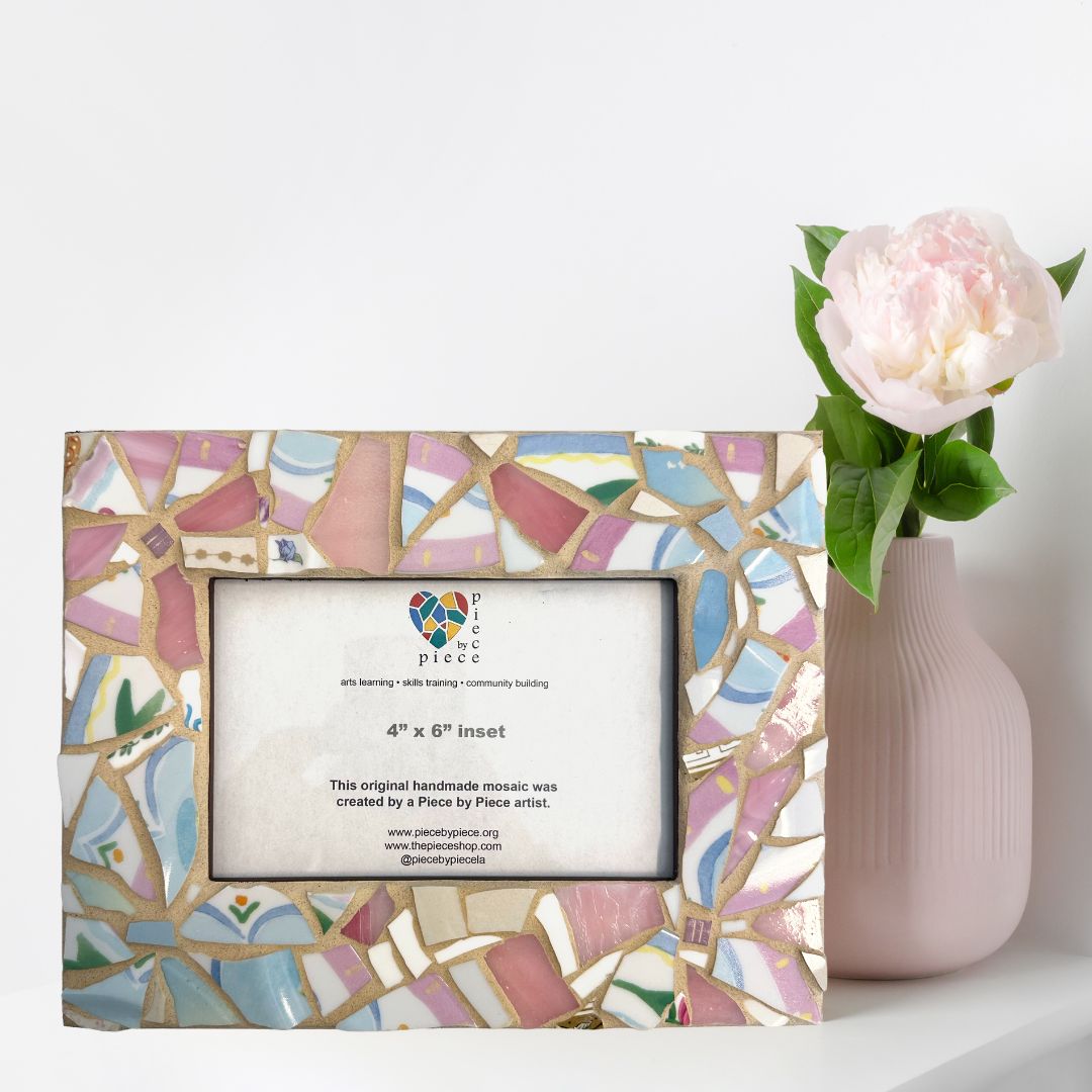 Soft and serene, this Pique Assiette frame features a dreamy palette of pastel pinks and sky blues. The mosaic is composed of interlocking shards of new and recycled ceramic, creating a flowing, organic border that feels both nostalgic and fresh. Delicate details emerge upon closer inspection, including fragments of floral patterns and glints of gold from the rims of repurposed tea sets.