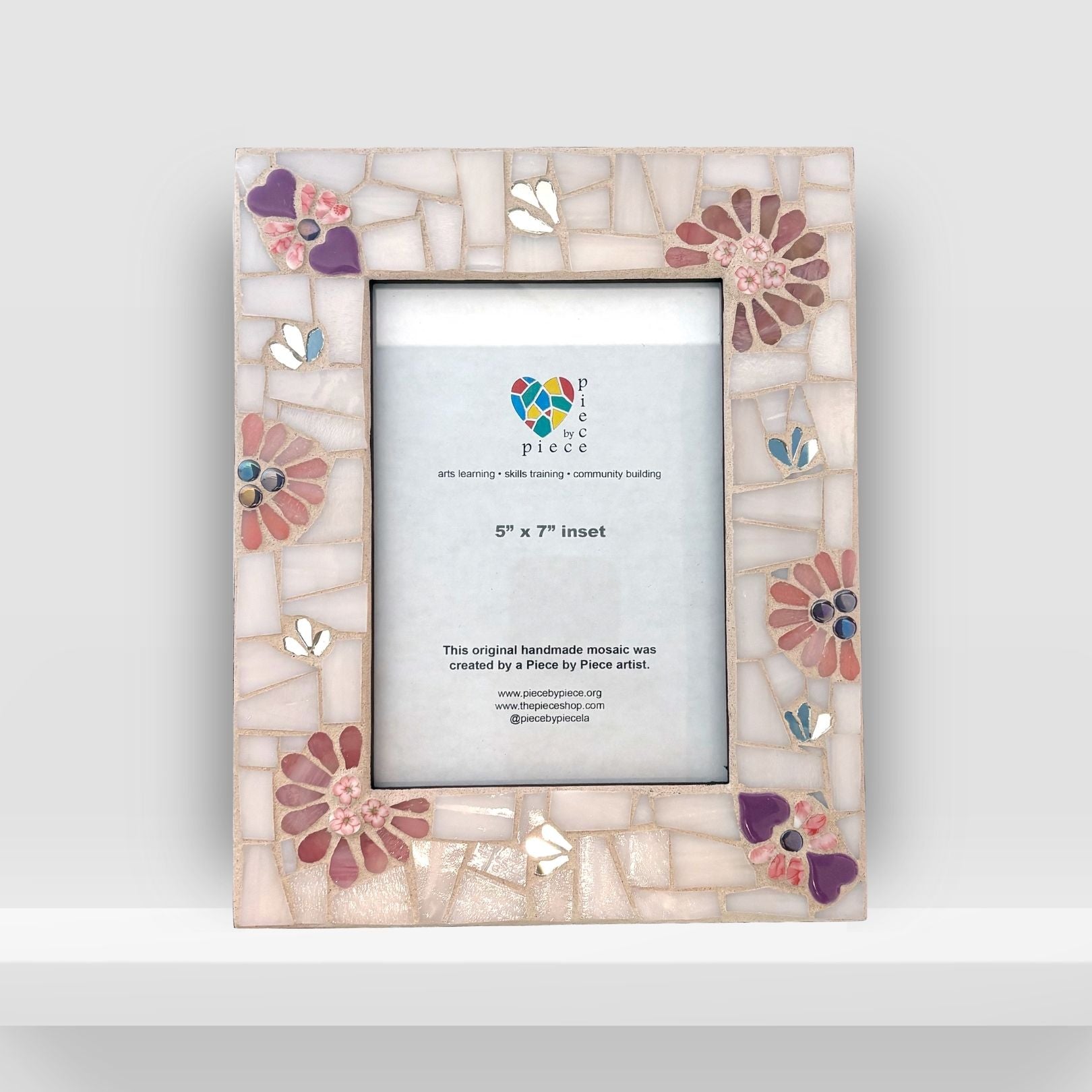 This frame was created as a collaborative process in the Piece by Piece social enterprise. One artist created the design, others painted and prepped, and another grouted.