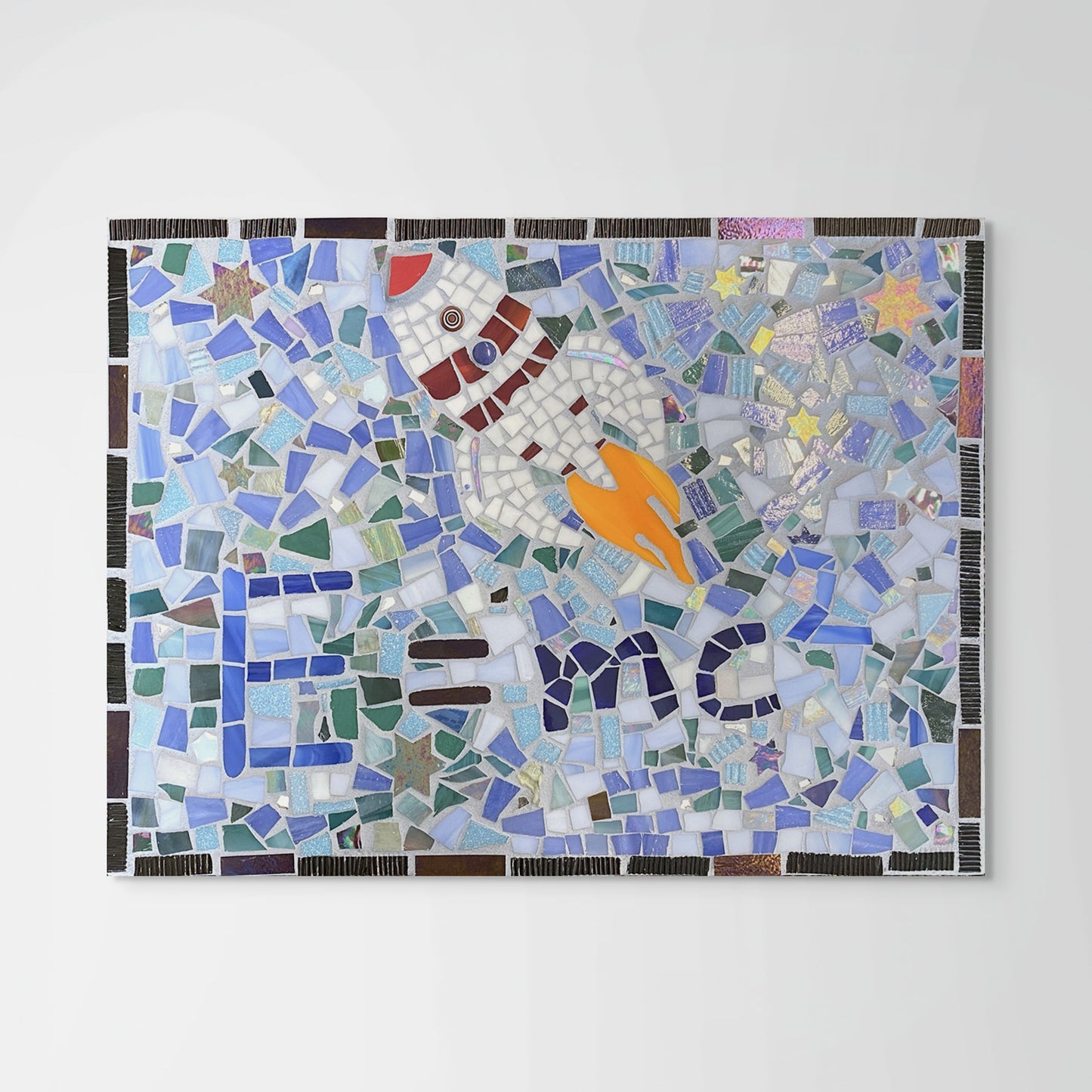 This dynamic 16" x 12" mosaic was created during the City of STEM + Los Angeles Maker Faire, an event that brings science, technology, and creativity together in one vibrant celebration. Featuring a detailed rocket ship soaring through a multicolored sky, the piece subtly weaves the iconic mass-energy equivalence formula—E=mc²—into the background, symbolizing the power of knowledge and imagination.