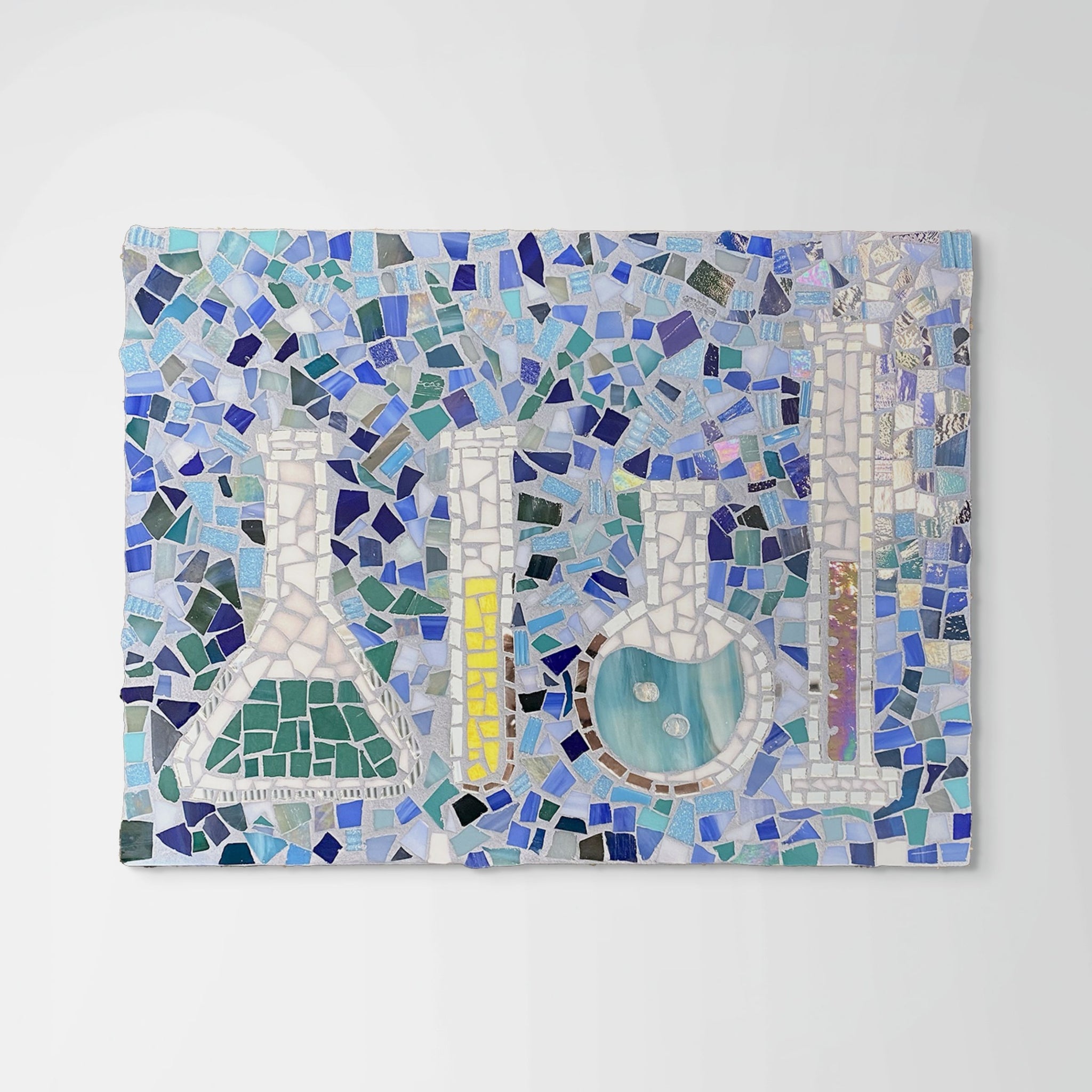 This vibrant 16" x 12" mosaic was created as part of a community art project during the City of STEM + Los Angeles Maker Faire, a festival celebrating science, creativity, and hands-on learning. Against a backdrop of varied blue tiles, mosaic renditions of an Erlenmeyer flask, test tube, boiling flask, and graduated cylinder come to life—paying tribute to the curiosity and experimentation at the heart of scientific discovery.