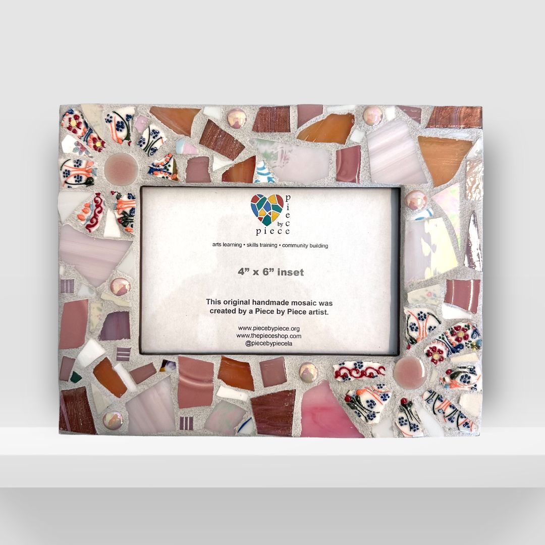 Warm and inviting, this mosaic frame brings together soft hues of dusty pink, mauve, and terracotta. The design is anchored by two stylized floral arrangements in opposite corners, crafted from vintage ceramic shards that feature delicate blue and red painted details. These blooms are surrounded by a patchwork of irregular ceramic fragments and accented with shimmering, iridescent glass gems that catch the light, adding a touch of elegance to the rustic palette.