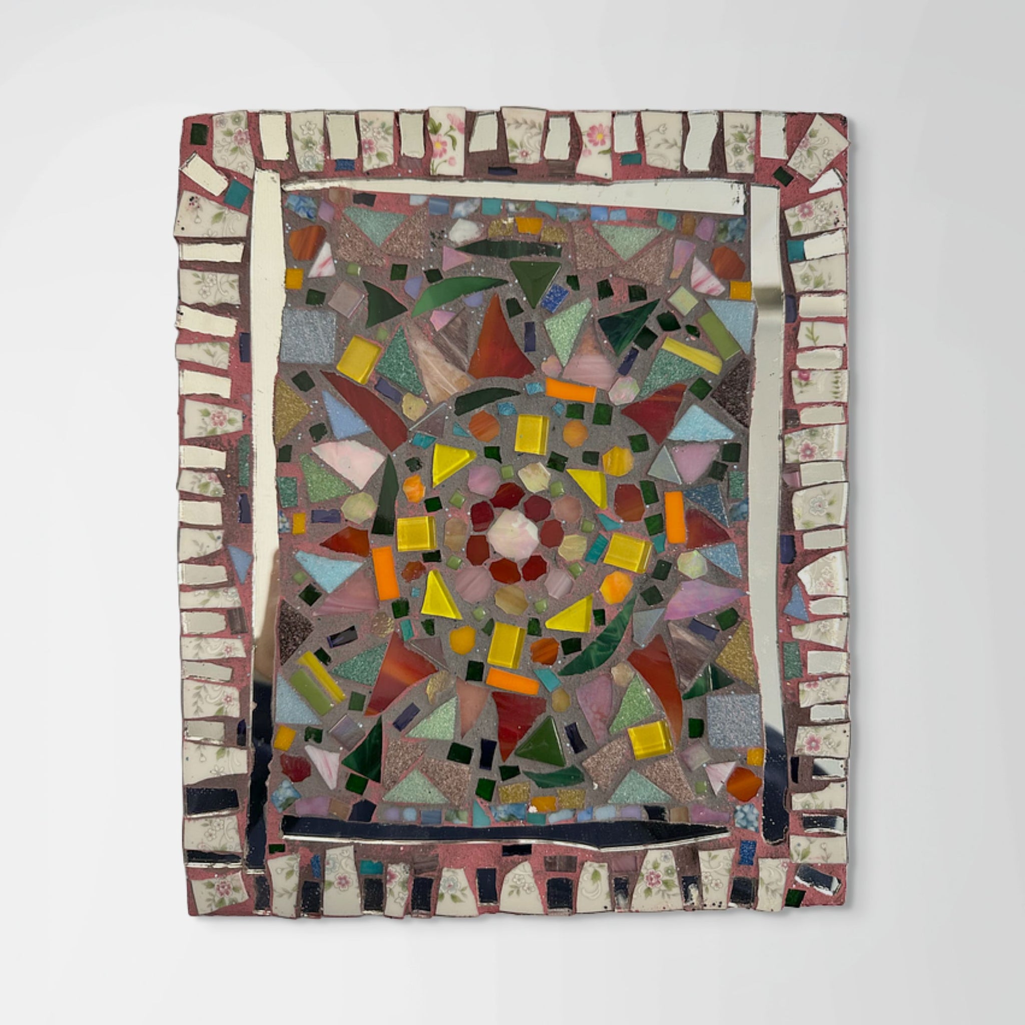 A vibrant celebration of culture and energy, this 10" x 12" mosaic captures the spirit of a joyous gathering. The centerpiece is a radiant sunburst design exploding with shards of yellow, tangerine, and red glass, surrounded by a kaleidoscope of glittering greens and blues. The composition is framed by vertical mirror strips that catch the light, while the outer border is crafted from broken vintage floral china, adding a layer of nostalgic texture and charm.