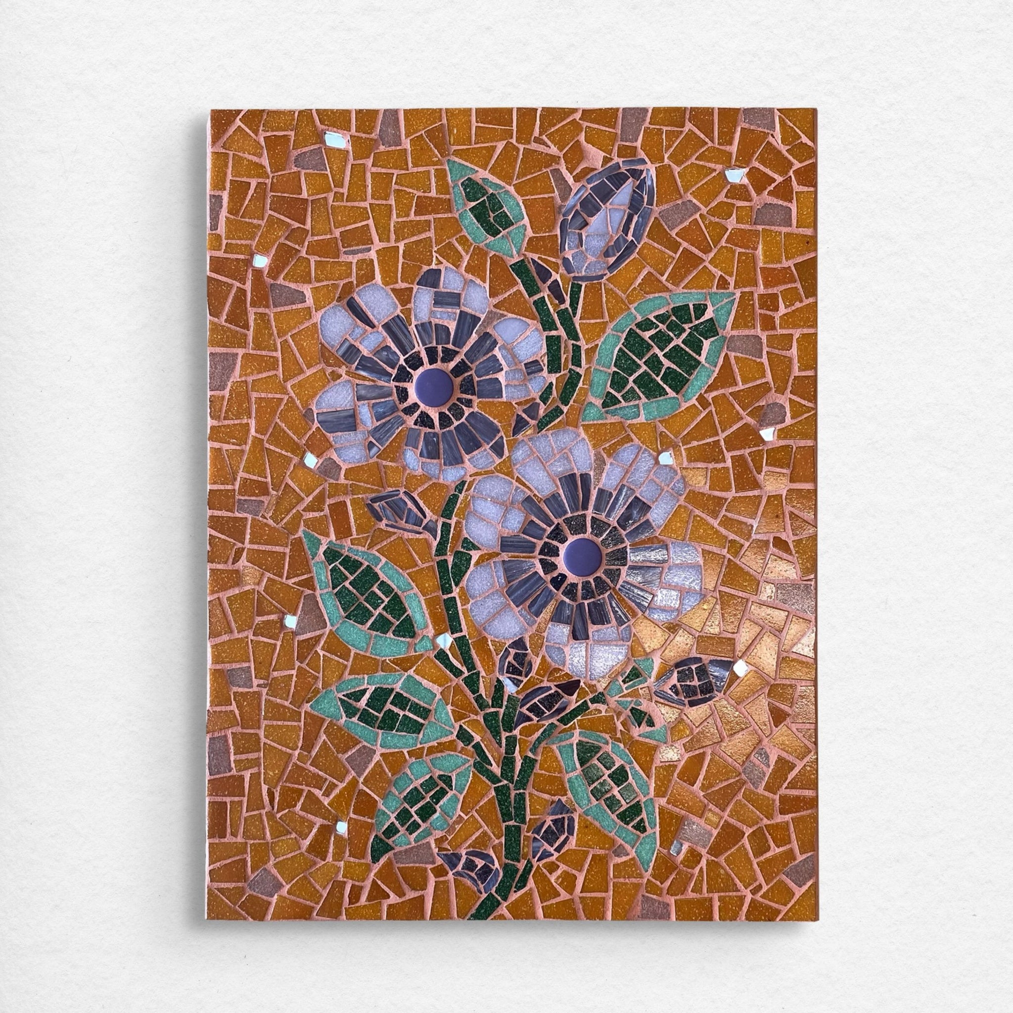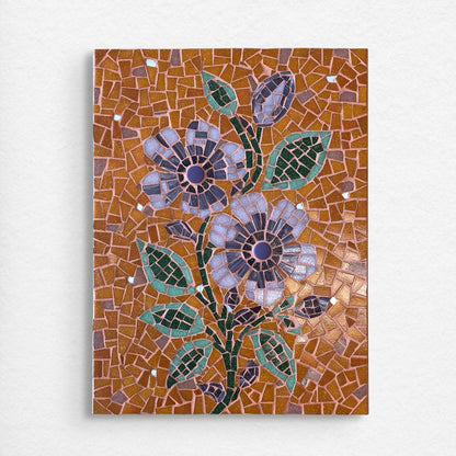 Detailed and realistic flowers in shades of purple dance along the canvas with their leafy green stems in this striking mosaic work of art. This 12" x 16" piece was carefully crafted by certified mosaic artist Norma C in our LA studio, drawing inspiration from her beautiful Mexican roots and experiences. Oaxaca is the state in Mexico where both these type of flowers and Norma originate. She also spent time working in a flower shop, developing her love for the beauty in florals as is evident in her work.