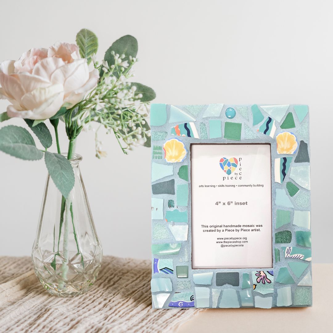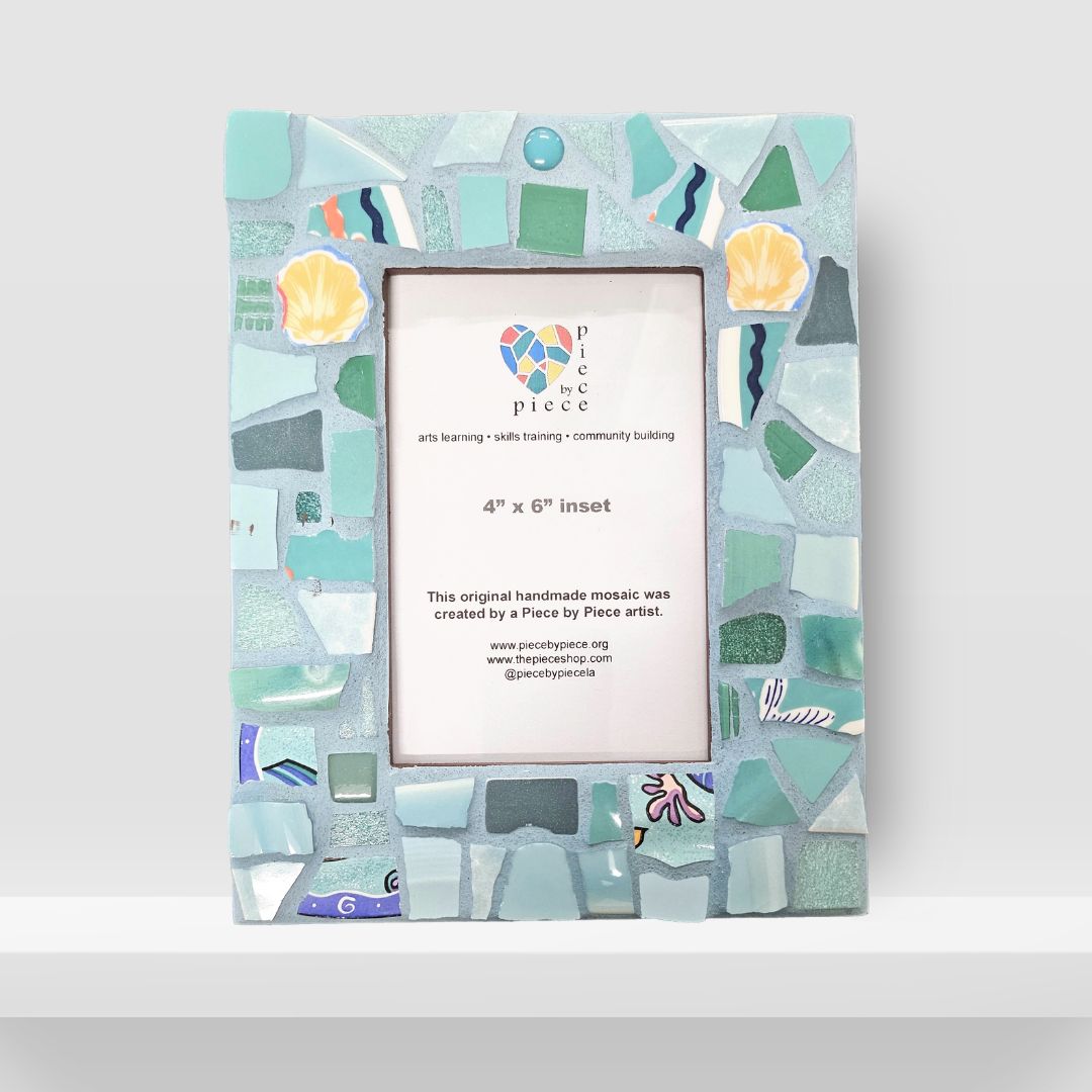 Mosaic tiles in shades of turquoise and sea foam, in pieces that have the appearance of sea glass, border the photo inset of this 7" x 9" frame. This frame was created as a collaborative process in the Piece by Piece social enterprise. One artist created the design, others painted and prepped, and another grouted.