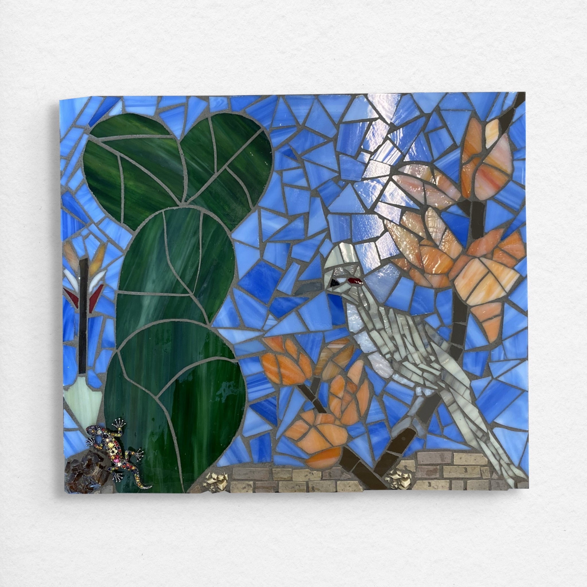 Sunlit hues come together in this 12" x 14" mosaic inspired by Kim’s grandmother’s front yard in New Mexico. Shades of blue, peach, and green echo the desert landscape—its resilient plants, wide skies, and quiet beauty. A jeweled lizard peaks up on the bottom left corner. Each carefully placed tile reflects both memory and renewal, capturing a sense of home and healing. Through creating mosaics with Piece by Piece, Kim has transformed her journey of resilience into art that honors family, connection, and the strength found in new beginnings.