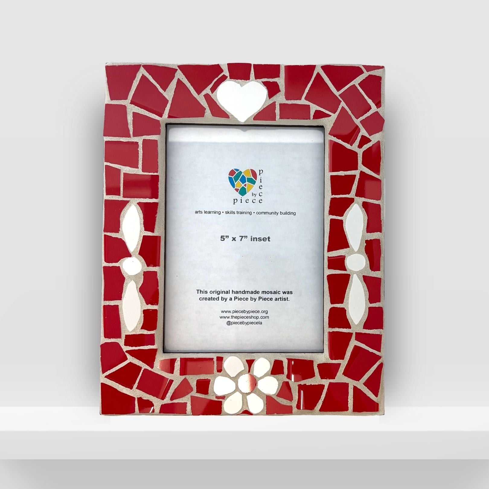 This frame was created as a collaborative process in the Piece by Piece social enterprise. One artist created the design, others painted and prepped, and another grouted.