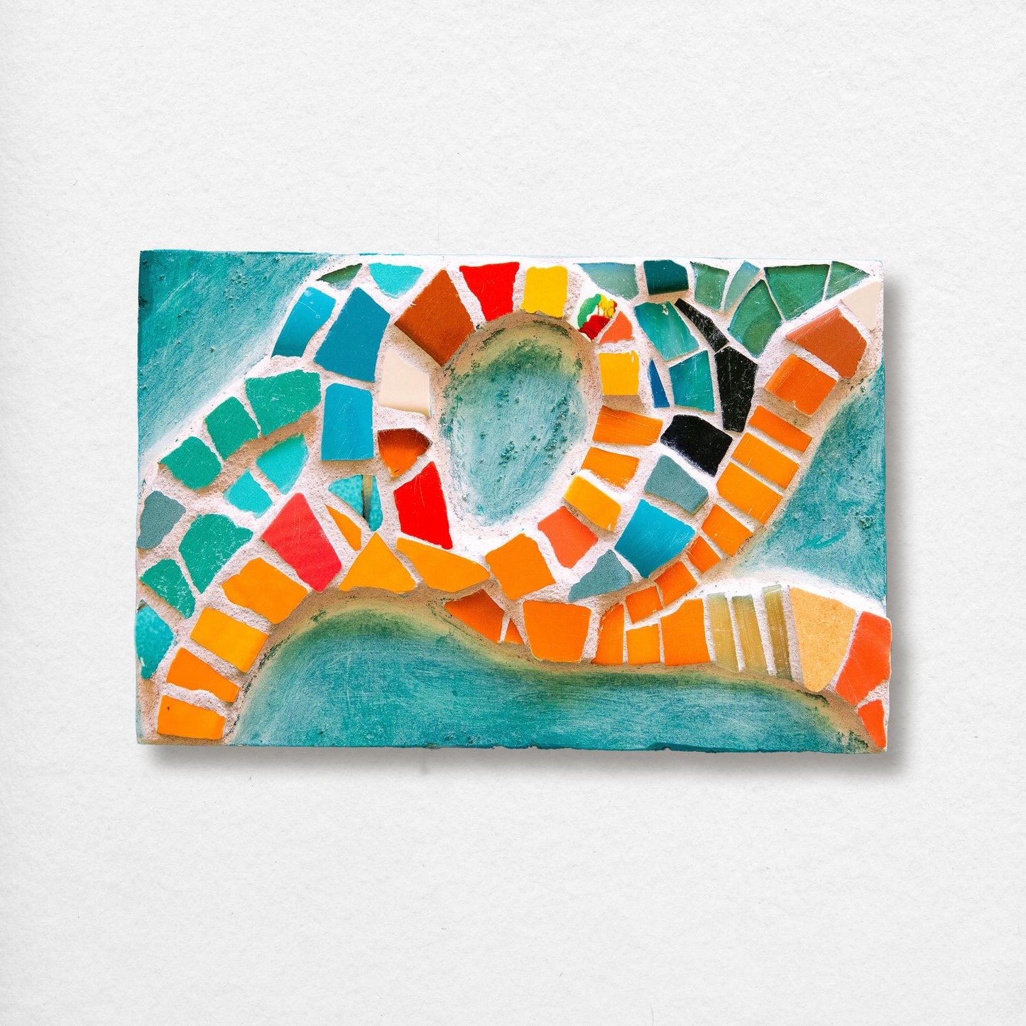 Orange and teal mosaic pieces mimic the way sunlight catches the edge of water in an ocean curl. This 9" x 6" work of art was handcrafted by certified artist Vicki M in our LA studio. Vicki came to Los Angeles County from Miami-Dade County in Florida, where she was born and raised.