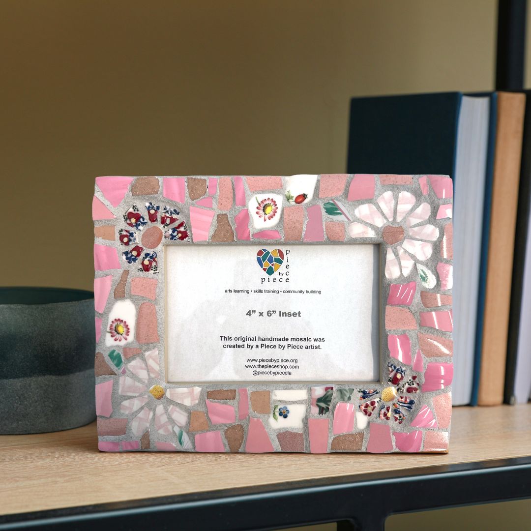A symphony of pinks brings this Pique Assiette frame to life, capturing the essence of a garden in full bloom. Shards of china have been meticulously arranged against a pink backdrop, forming a lush border of vibrant flowers and leafy greens that embrace the corners of the photo opening.