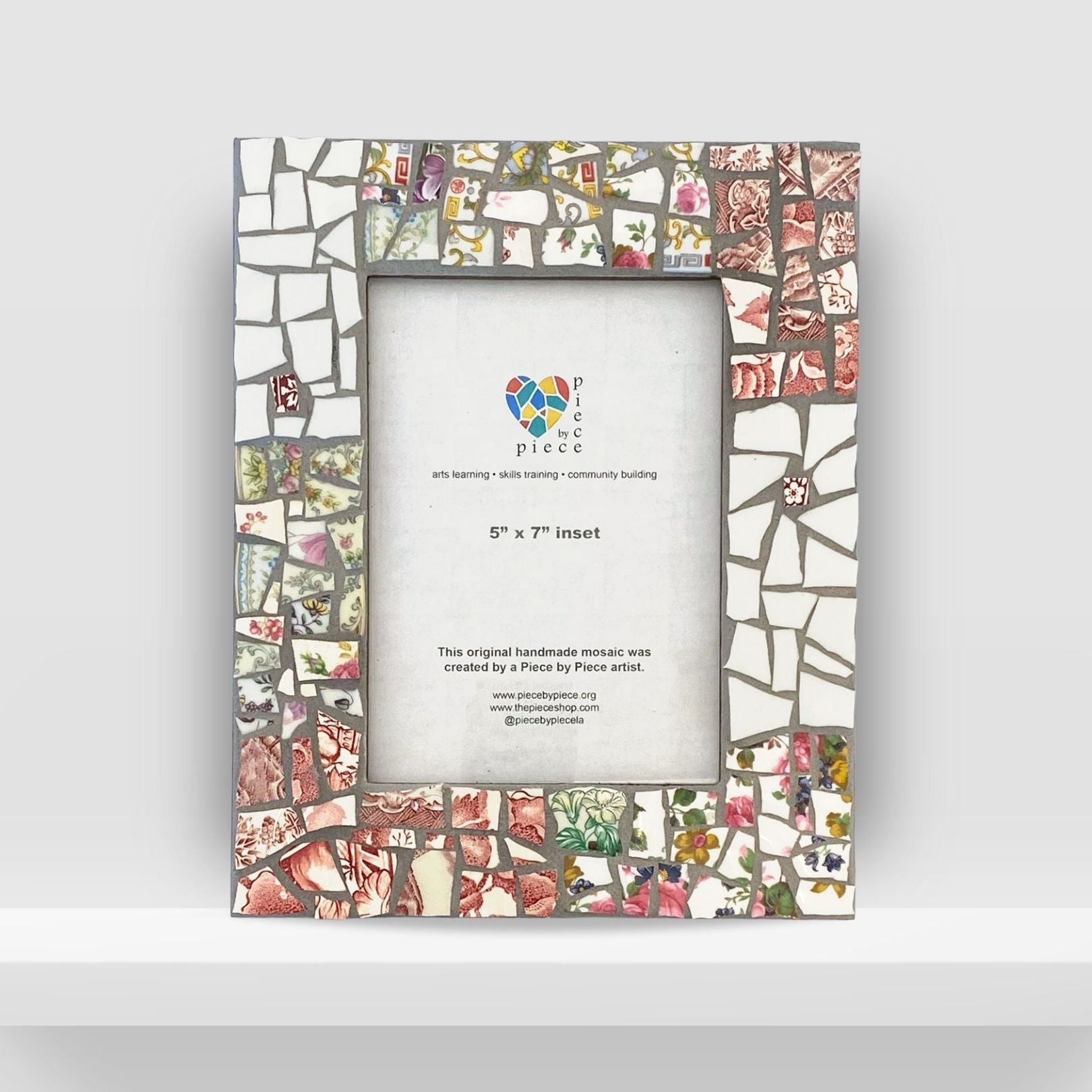 Embracing the nostalgic charm of Pique Assiette, this frame is composed of delicate floral china shards in romantic shades of rose, sage, and cream. The intricate patterns of vintage tableware are reimagined into a classic border that feels like a treasured garden heirloom, perfect for preserving a special memory. This piece was created through a collaborative process at the Piece by Piece social enterprise: one artist conceptualized the design, others prepped the materials, and another applied the final grout.