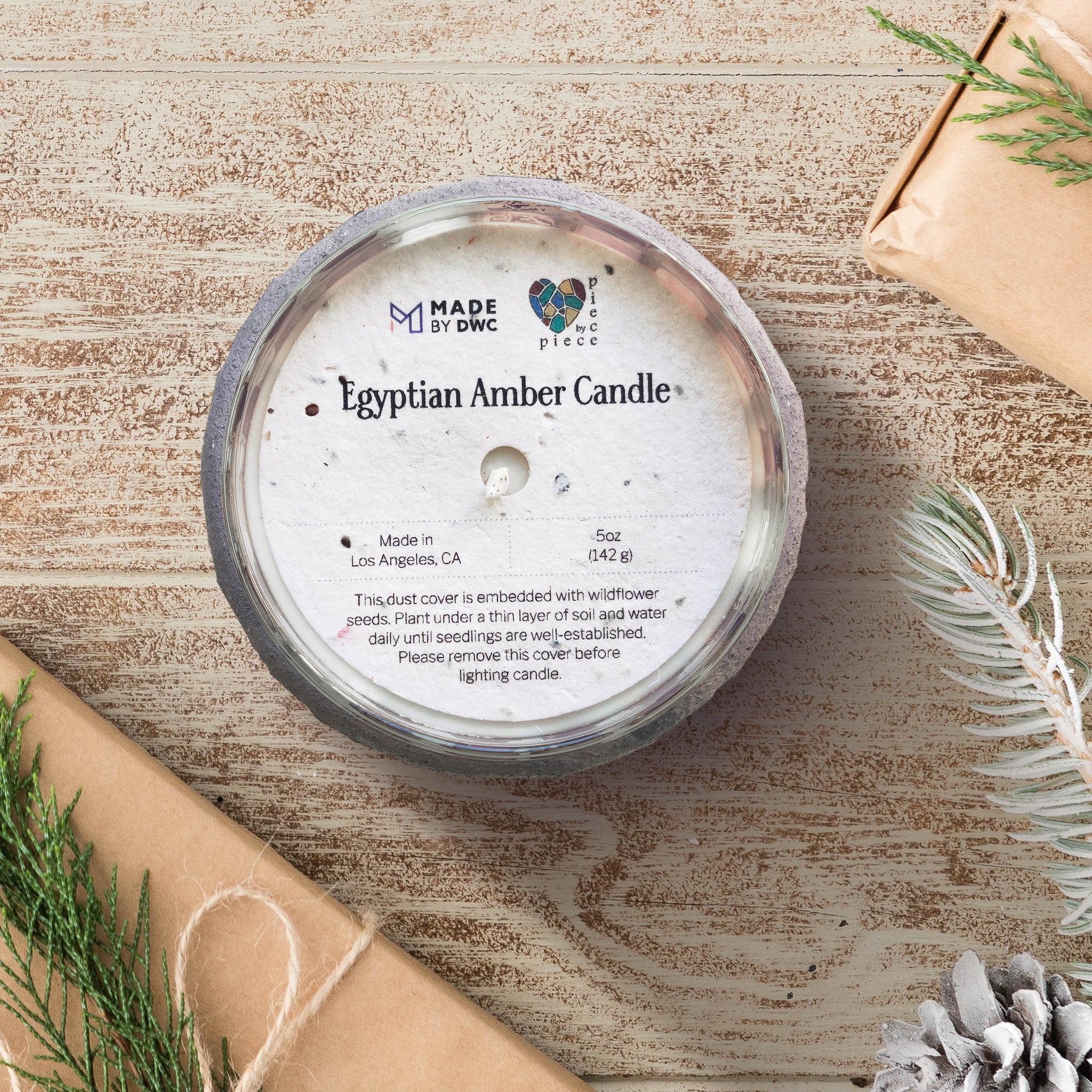 The candle’s scent has notes of cotton blossom, linen, and powder. Also available in Blue Egyptian Amber.The candle dust covers are made from 100%-recycled material and embedded with wildflower seeds—simply plant, water, and watch a garden bloom.MADE by DWC is a social enterprise created by the Downtown Women’s Center and it stands as a beacon of hope in Los Angeles, tirelessly working to end homelessness for women through employment. This is not just a brand; it’s a movement towards a brighter, safer, and more inclusive future for all women. Your purchase is more than a transaction; it's a pledge to stand by women reclaiming their lives.Piece by Piece is not just an art initiative; it's a sanctuary where participant artists from marginalized communities across Los Angeles come together to heal, learn, and grow. Through the art of mosaic creation, individuals rebuild their sense of self, forge community bonds, and acquire marketable skills that pave the way for financial independence and personal fulfillment. Each purchase is a testament to resilience, a nod to artistry, and a step towards a future brimming with opportunities.