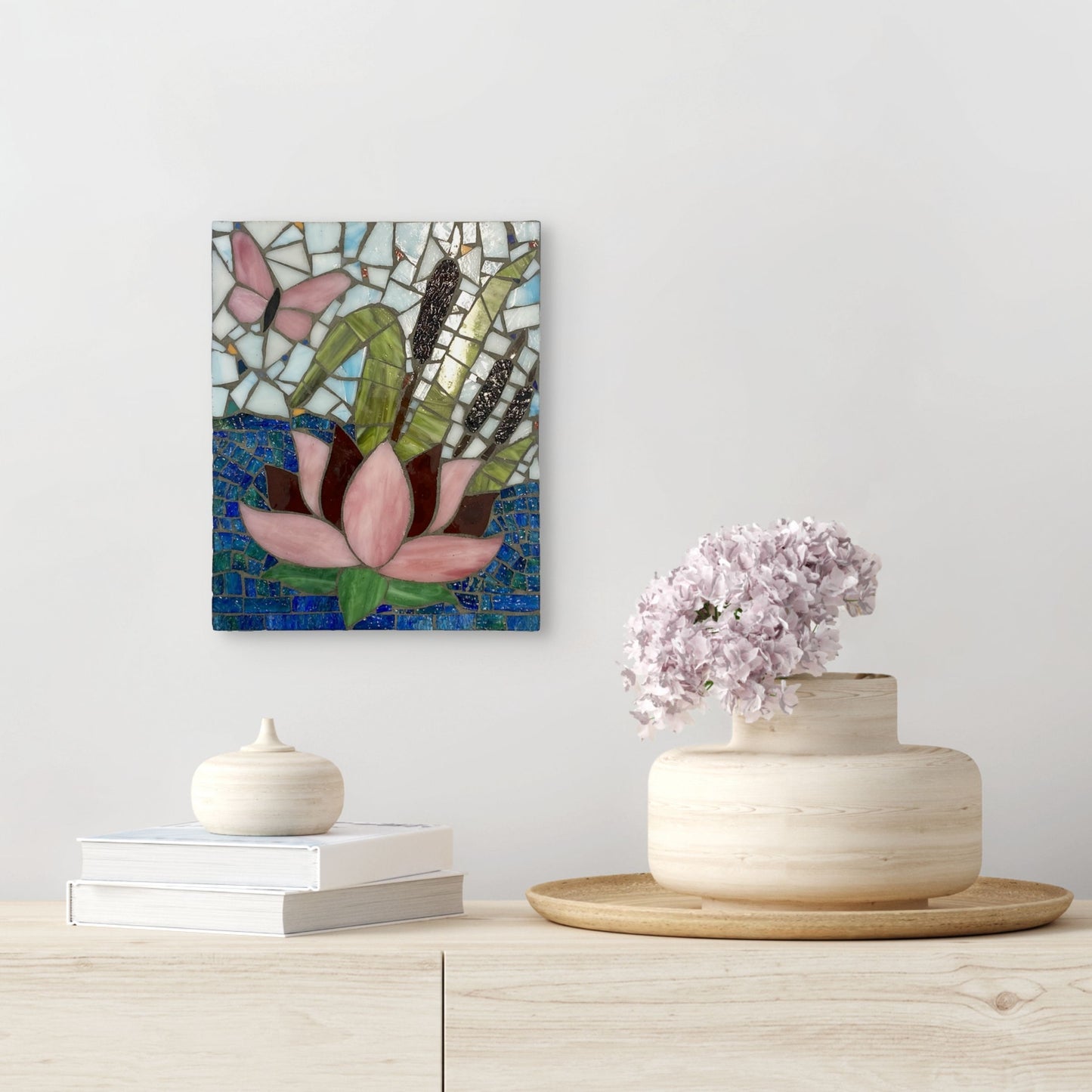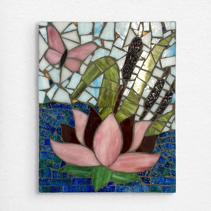 This 8" x 10" mosaic work of art depicts a serene day looking out over a pond - a pink water lily floats on the surface of the water while a matching pink butterfly travels overhead towards the grasses growing from the water.